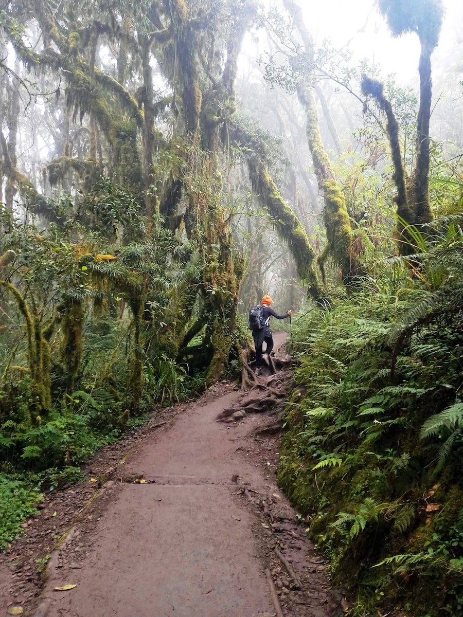 The moorland landscape remains with its dusty, rocky ground and low grasses and shrubs. The bright everlastings erupt from the ground and the concentric rings of leaves on the celestial lobelias are astonishing. The scenic views of the towering mountain are best observed from this area and the path is generally flat.